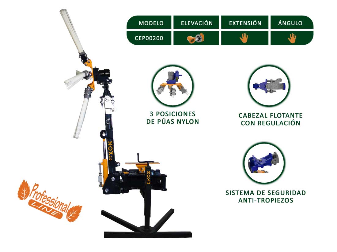 Extra-reinforced sweeper of Perendreu model NOX2.0 1P with a standard chassis with one hydraulic cylinder and two manual functions; principal elevation of the sweeper with hydraulic cylinder with hydraulic lock valve, hydraulic flow regulators and greasers in all the joints, header manual system extension using bolt mounting, manual regulation of the fron angle with various mounting points.