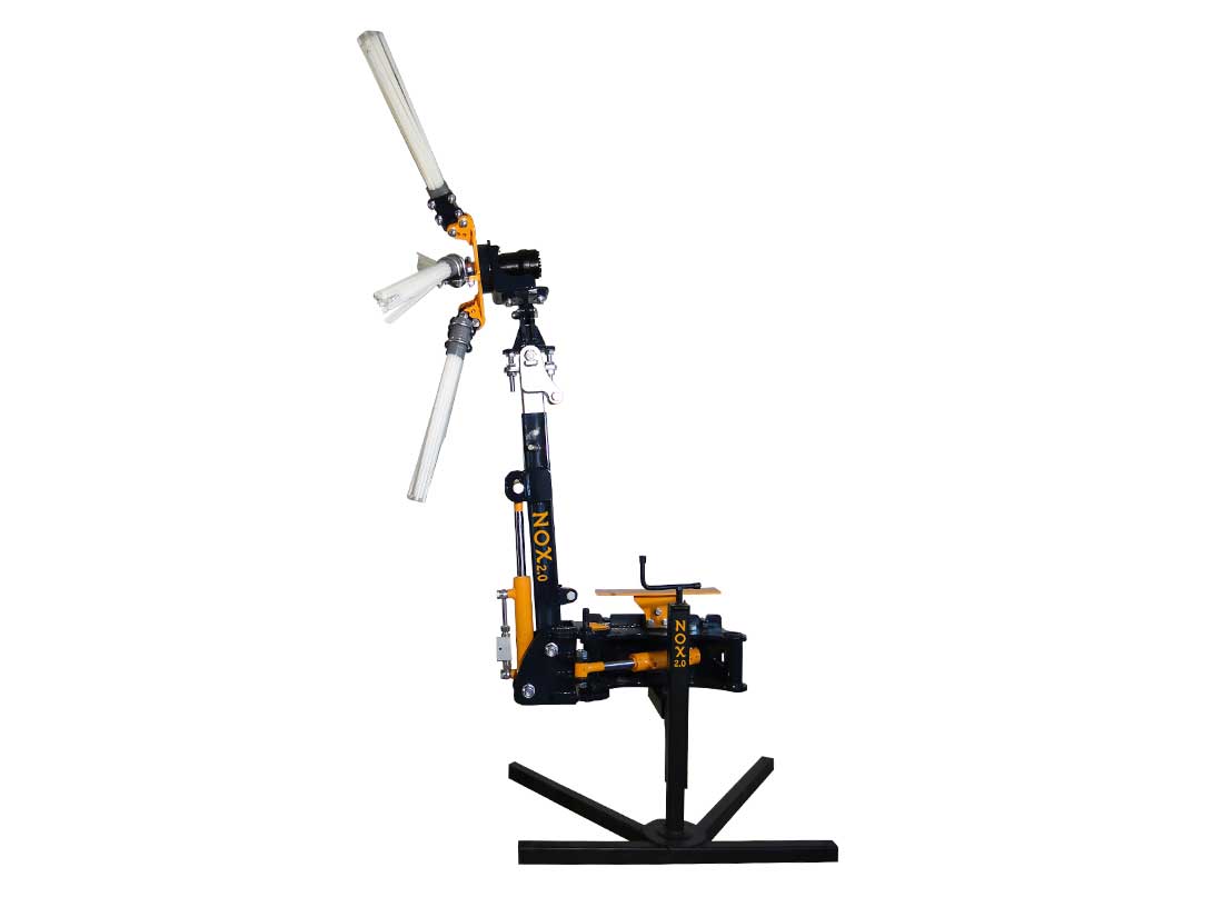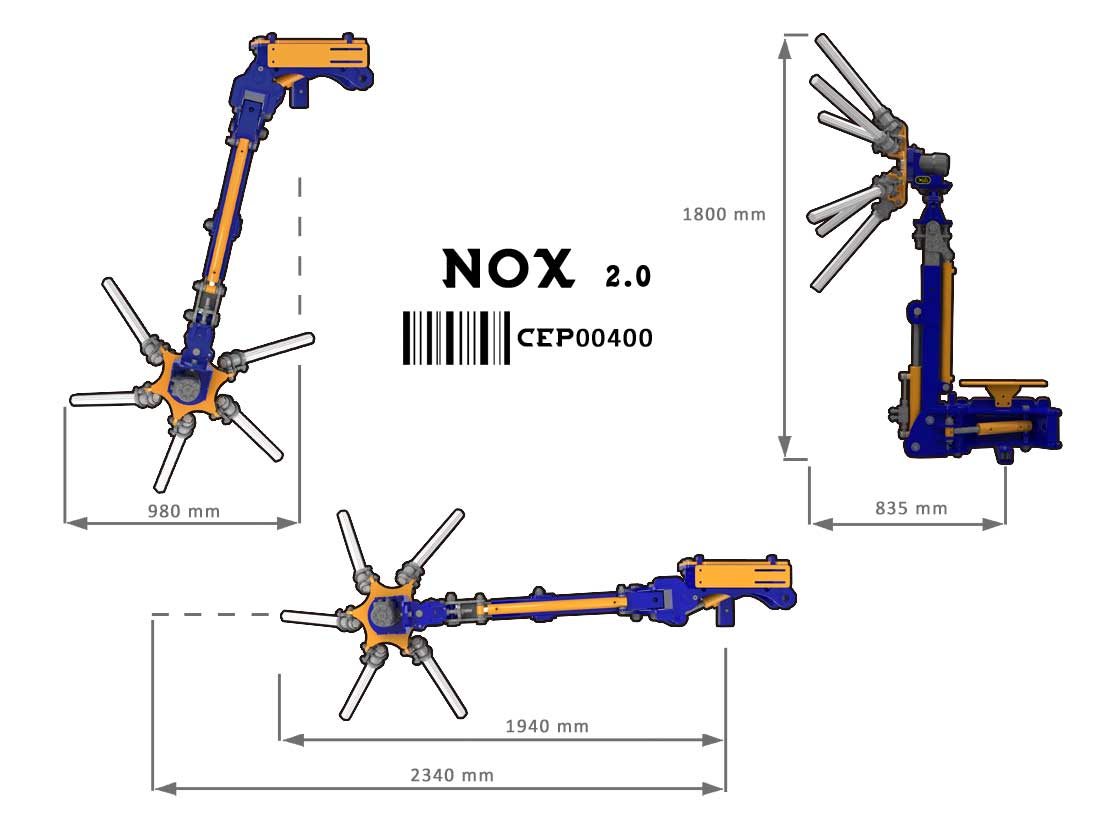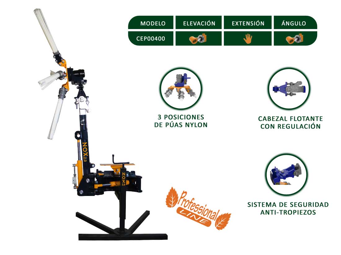 Extra-reinforced sweeper of Perendreu model NOX2.0 2P-B with a standard chassis with two hydraulic cylinders and one manual function; principal elevation of the sweeper with hydraulic cylinder with hydraulic lock valve, hydraulic flow regulators and greasers in all the joints, header manual system extension using bolt mounting, manual regulation of the fron angle with various mounting points.
