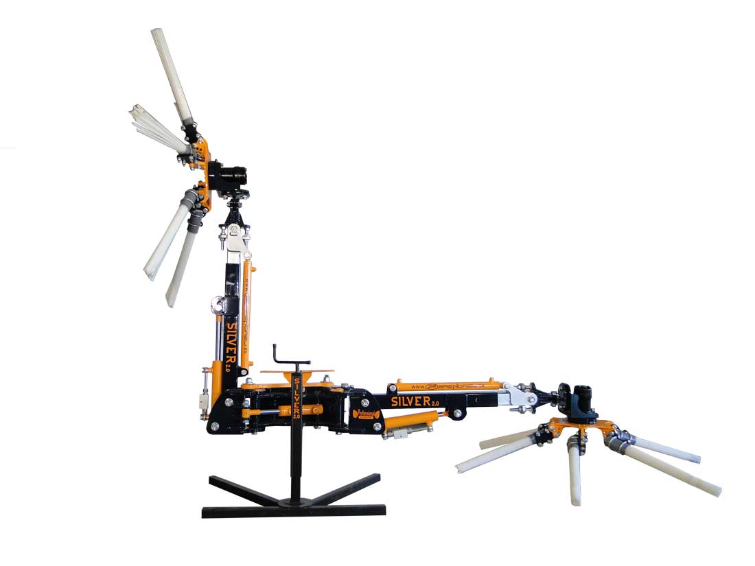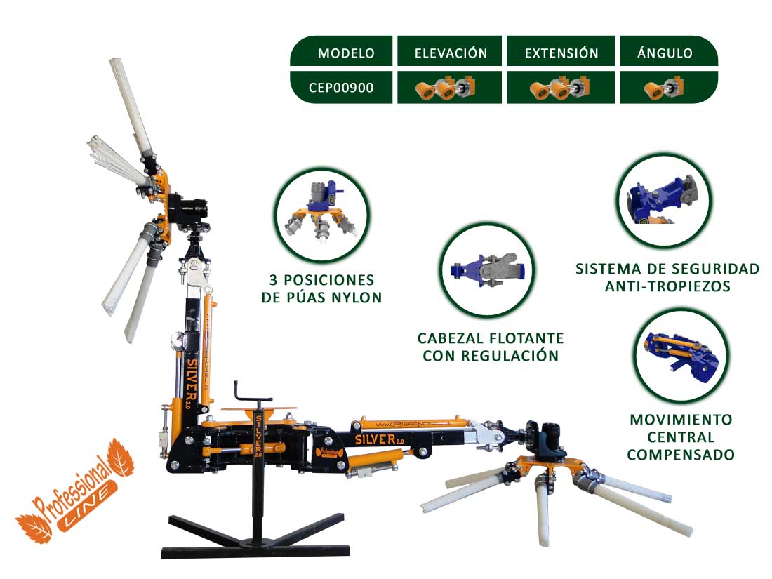 Double sweeper of Perendreu model SILVER 2.0 5P with a standard chassis with five hydraulic cylinders; principal elevation of the sweeper with hydraulic cylinders with hydraulic lock valve, hydraulic flow regulators and greasers in all the joints, header manual system extension using bolt mounting, Perendreu system for center offset where with a single hydraulic front cylinder varies the angle on both sides of the sweeper opening or closing with hydraulic flow regulator, manual regulation of the fron angle with various mounting points.