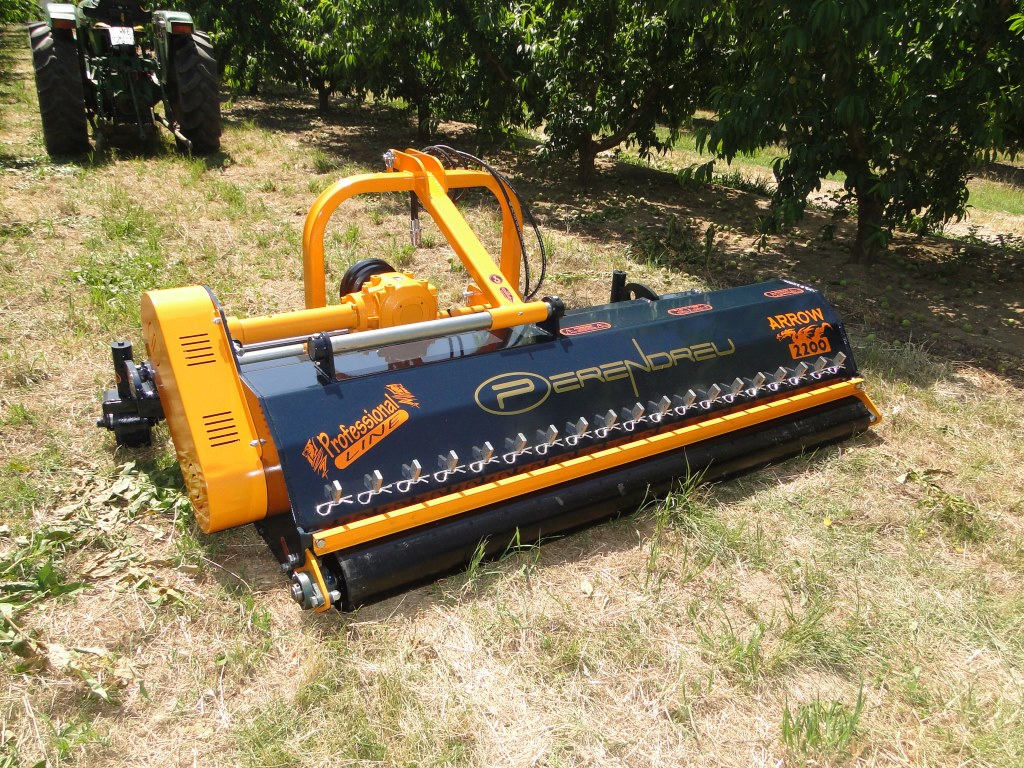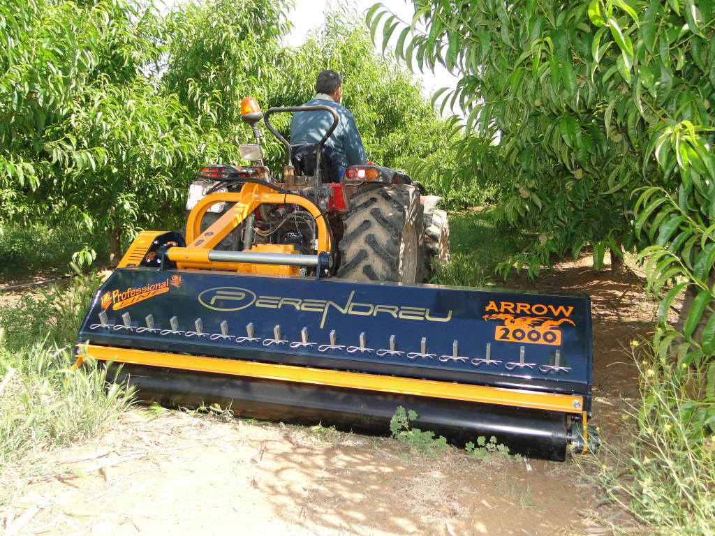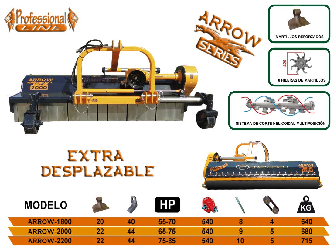Trituradora de restos de poda profesional reforzada modelo ARROW de la marca Perendreu versión Extra-Desplazable donde encontraran un desplazamiento de la torreta unos 15cm adicionales respeto con el modelo estándar quedando casi centrada para su transporte. Trituradora ideal para siega de la hierba y el triturado de las ramas de poda hasta 8cm de diámetro. Chasis principal de la trituradora fabricado en chapa de 8mm con doble hilera de retenedores internos en forma de “U” fabricados por Perendreu en platina anti desgaste. Palas delanteras de fabricación propia con contorno de pala completamente cerrado, en acabado en base de Zinc con barra de soporte reforzada y una boca de entrada de 280mm. Barras guía de la torreta muy reforzadas y en baño de Cromo de gran longevidad.