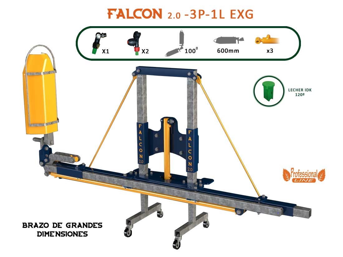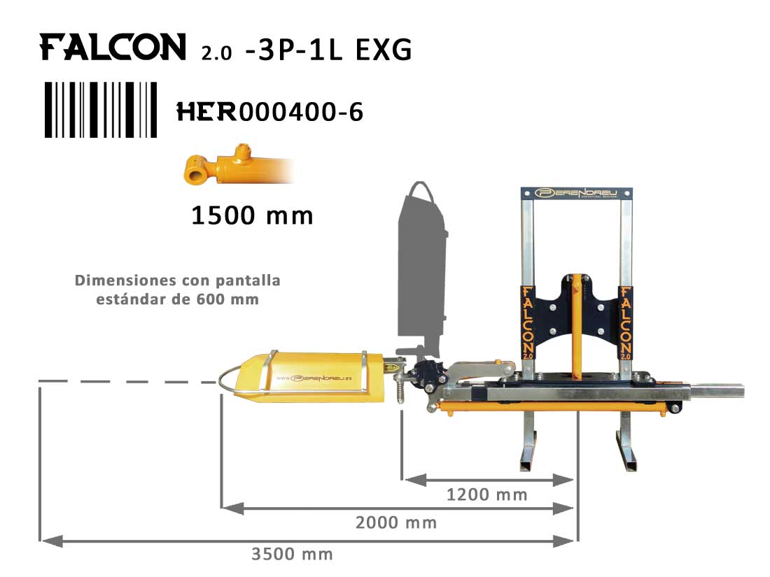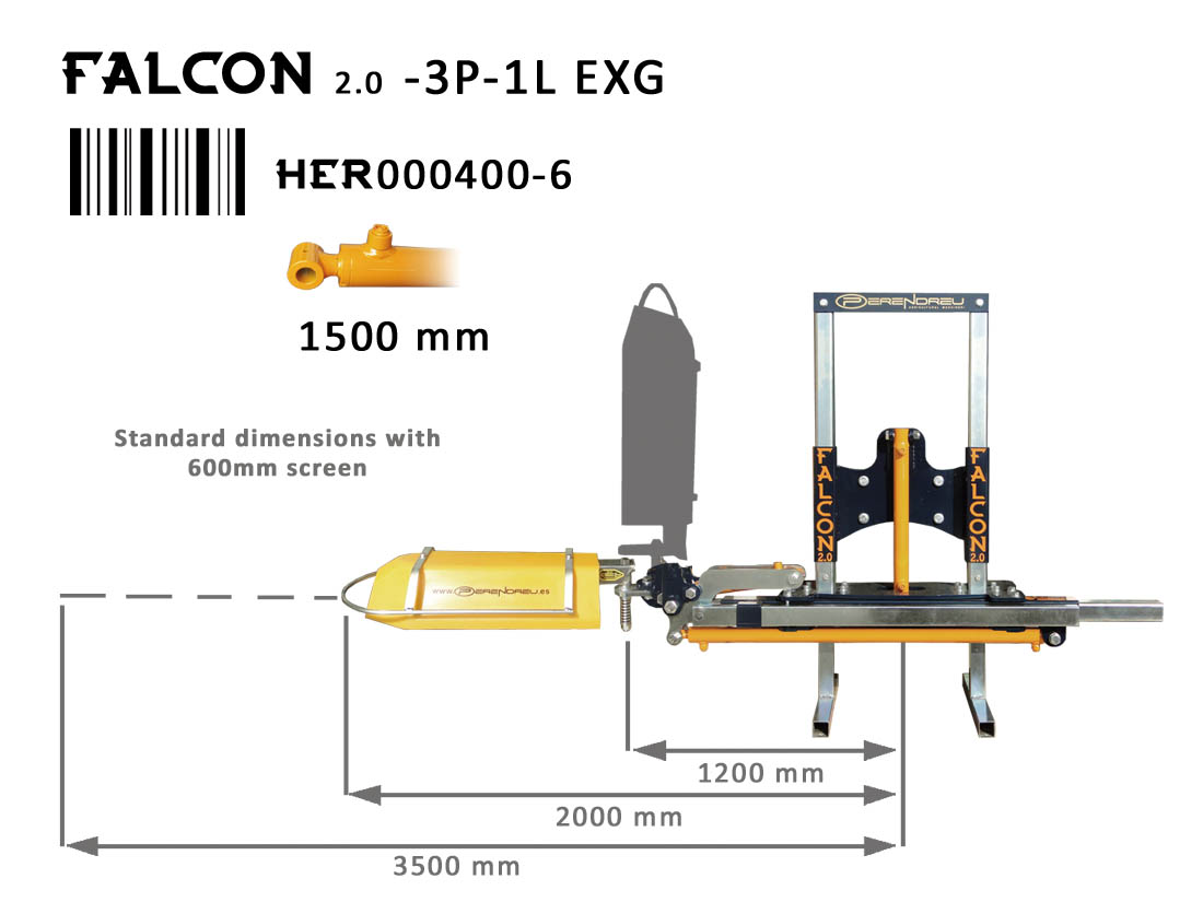 Barra herbicida a un lado reforzada extra-grande de la marca Perendreu modelo FALCON 2.0 -3P-1L EXG referencia HER000400-6 dotada con tres cilindros; un cilindro hidráulico de elevación principal del chasis, un cilindro hidráulico de extensión de brazo de la pantalla y un cilindro hidráulico de inclinación de la pantalla con regulación de hasta 100º.