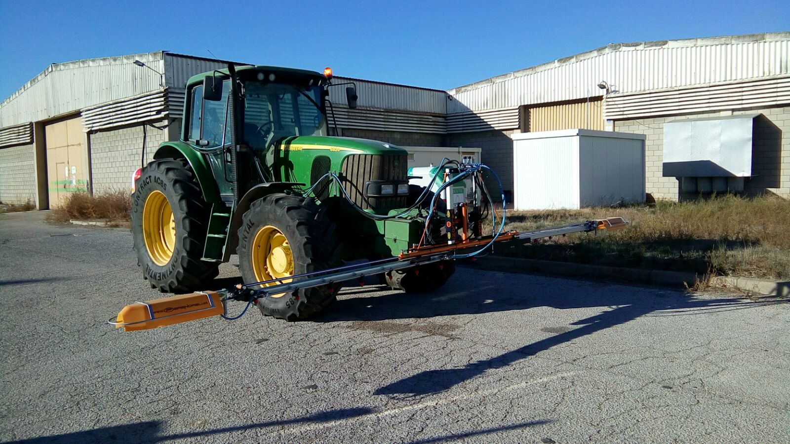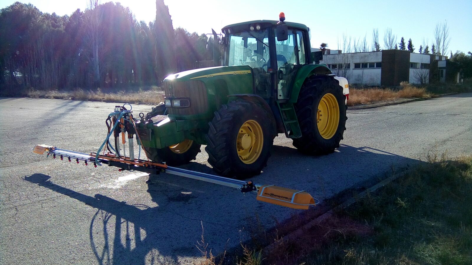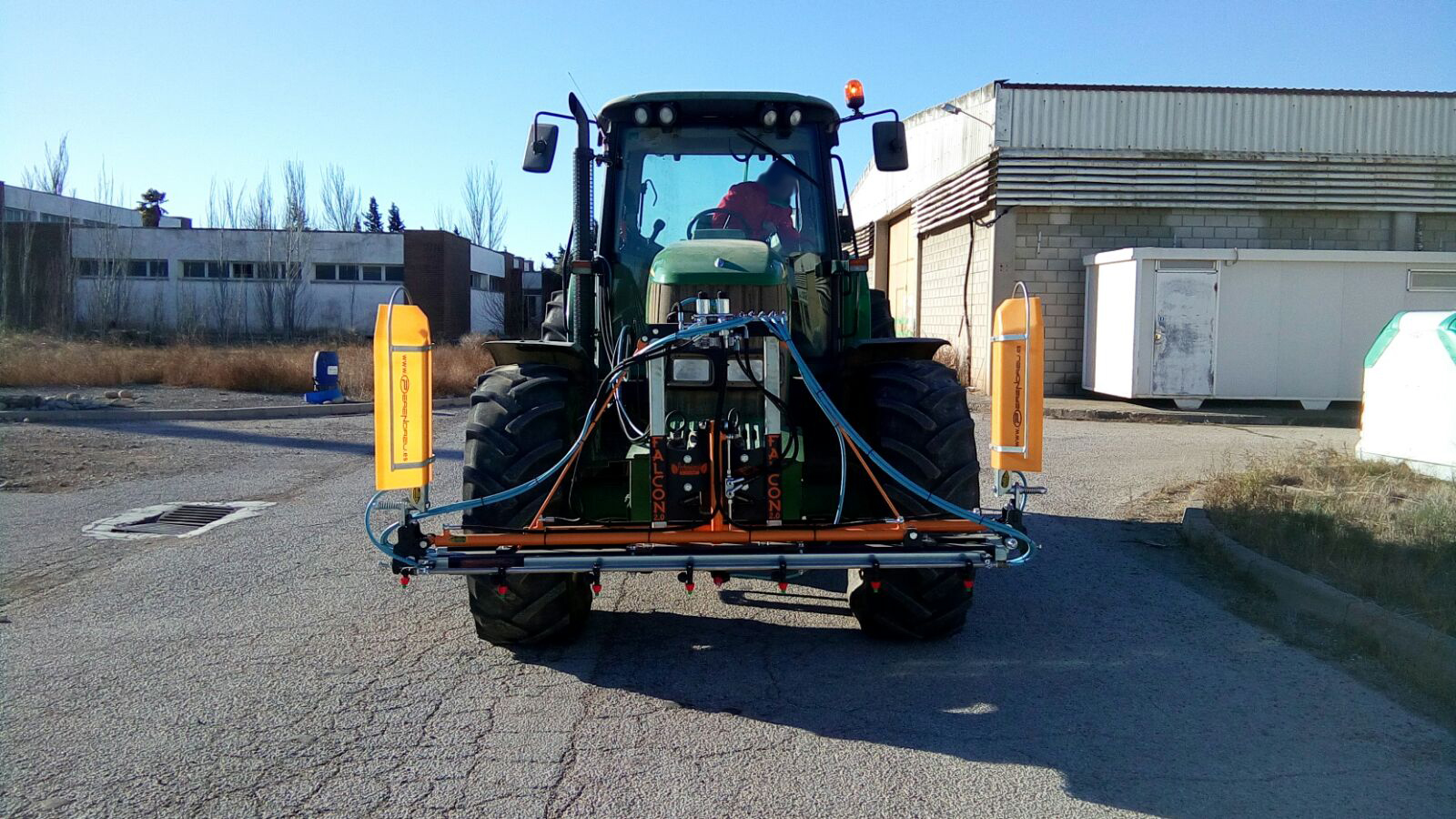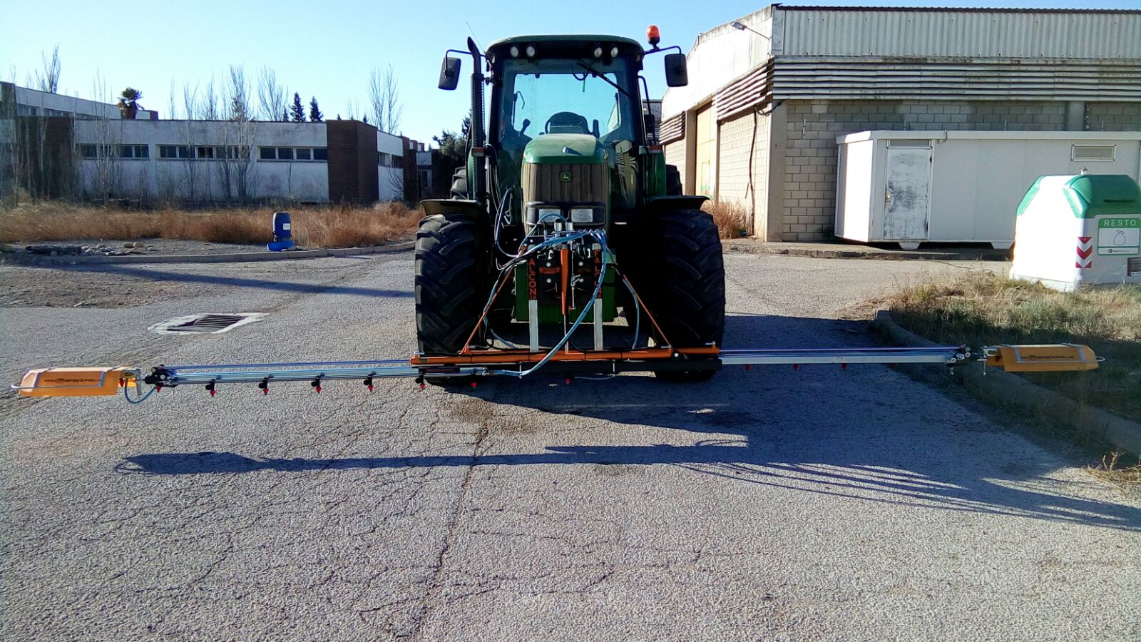 Barra herbicida a dos lados reforzada extra-grande de la marca Perendreu modelo FALCON 2.0 -3P-2L EXG referencia HER000500-6 dotada con tres cilindros; un cilindro hidráulico de elevación principal del chasis y dos cilindros hidráulicos independientes con sistema especial, donde combina la bajada y la extensión del brazo de la pantalla con un sistema especial de tensión continua en pantalla para evitar movimientos involuntarios.