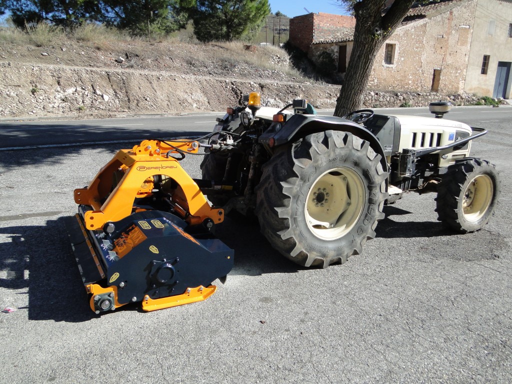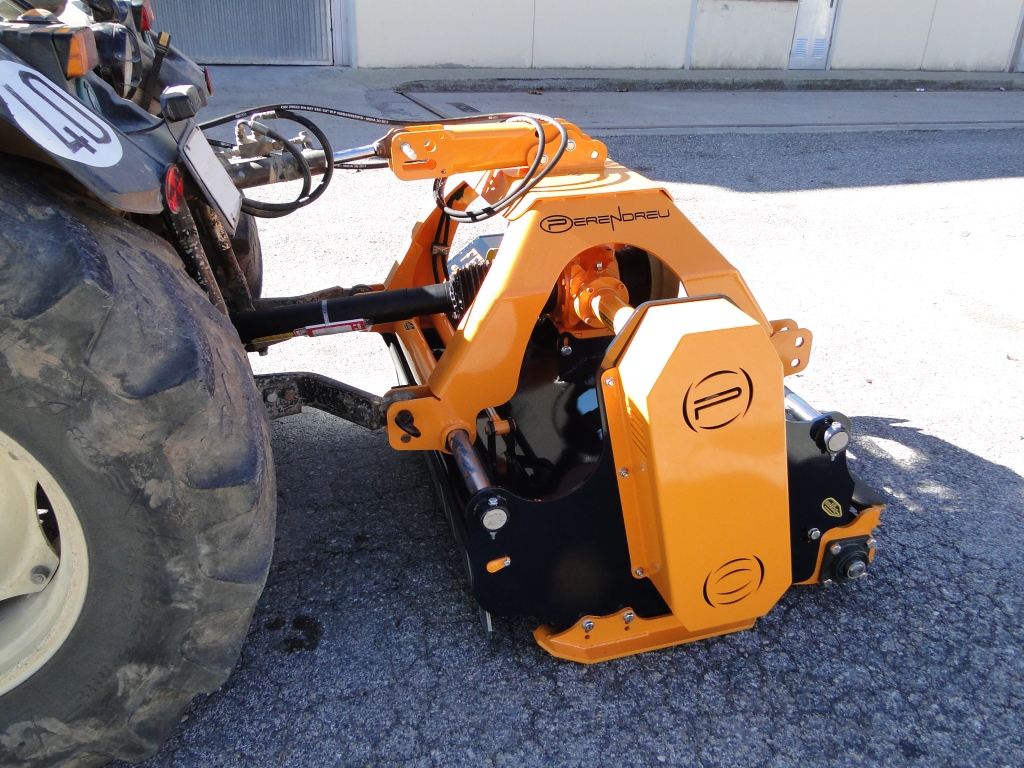 Torreta reforzada con el sistema estándar de tres puntos a los dos lados, anclajes para rotulas de 25/28mm y 19/25mm. Grupo reforzado con distinta cantidad de correas tipo “C” dentadas según modelo. Retenedores traseros para los restos de poda. Limpiador de rulo en forma de “U” reforzada ajustable en altura. Rulo trasero reforzado de 200 mm, cuatro rodamientos del rulo trasero de serie y sistema de regulación de altura por platinas multipunto para una optimización del trabajo de los martillos/cuchillas. Tapa de las poleas reforzada con agujeros de refrigeración. Sistema de rotor especial en helicoidal multiposición de Perendreu con ocho hileras de martillos reforzados, dotados con tornillos de 20mm de diámetro y un total de 470mm de diámetro de rotor. Rodamientos de rodillos oscilantes de calidad con retenes y refuerzos de retenes en rotor. Patines, cardan, bulones y cilindro hidráulico con tubos hidráulicos de serie incluidos en la trituradora.