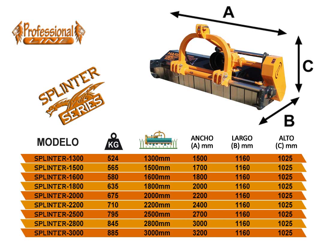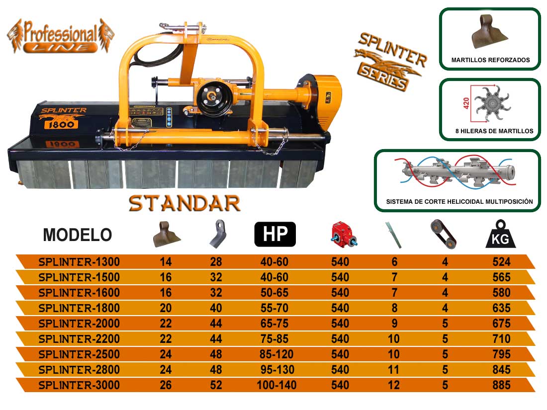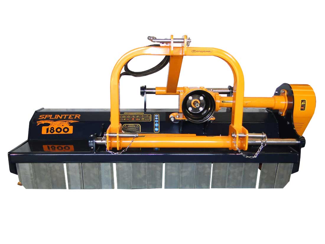 Trituradora de restos de poda profesional reforzada modelo SPLINTER de la marca Perendreu versión estándar donde encontraran una maquina ideal para siega de la hierba y el triturado de las ramas de poda hasta 8cm de diámetro. Chasis principal de la trituradora fabricado en chapa de 8mm con doble hilera de retenedores internos en forma de “U” fabricados por Perendreu en platina anti desgaste. Palas delanteras de fabricación propia con contorno de pala completamente cerrado, en acabado en base de Zinc con barra de soporte reforzada y una boca de entrada de 280mm. Barras guía de la torreta muy reforzadas y en baño de Cromo de gran longevidad.